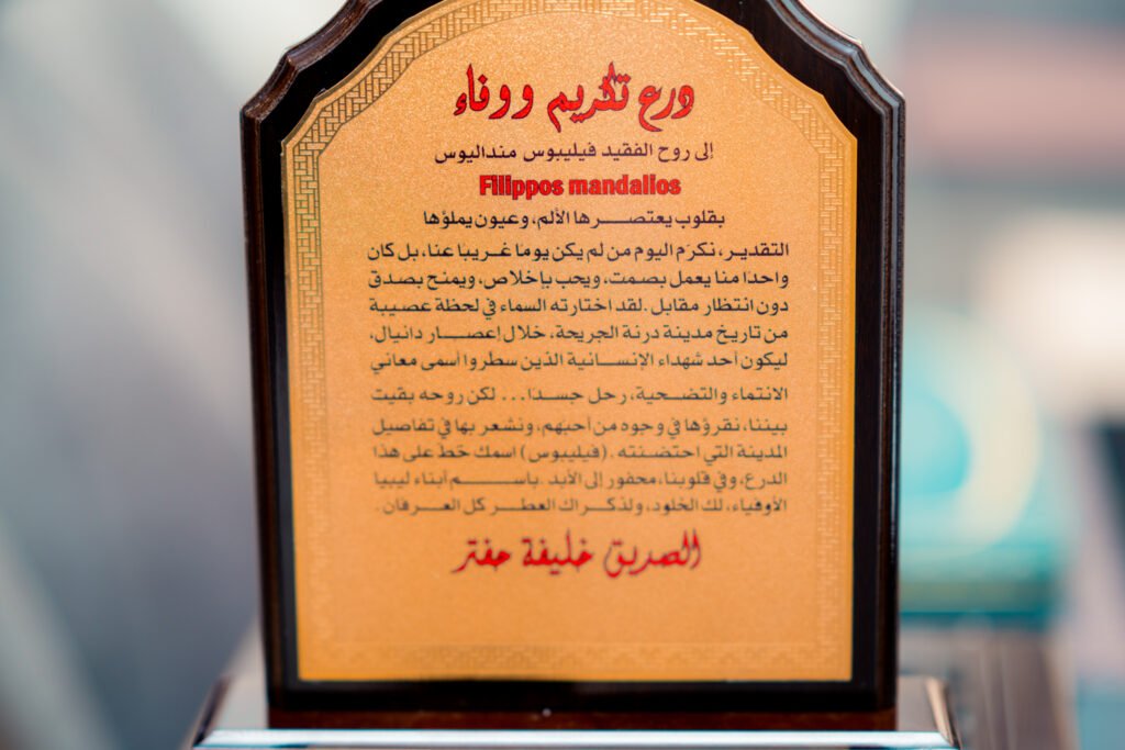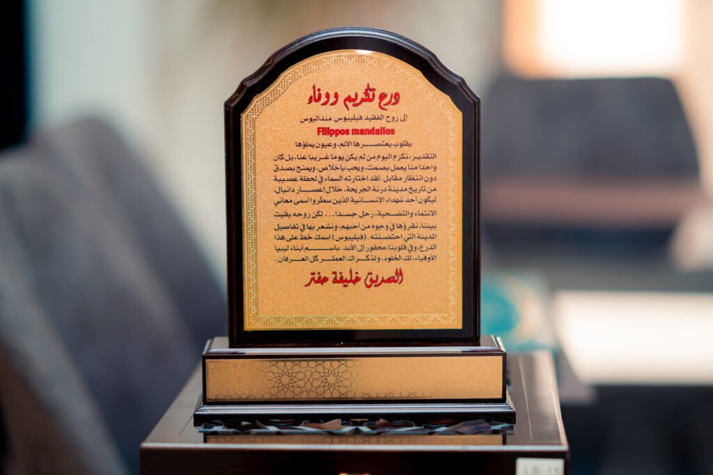 قام الدكتور الصدّيق خليفة حفتر، رئيس المفوضية العليا للمصالحة الوطنية، بزيارة إنسانية إلى عائلة الراحليْن أنجيليكي وفيليپوس منداليوس اللذين قضيا في فاجعة فيضان درنة. وقدّم خلال الزيارة درعًا تكريميًا يحمل كلمات وفاء تُجسّد عمق الانتماء والتضحية التي مثّلتها أنجيليكي، التي عملت بصمت وأحبّت ليبيا بإخلاص.